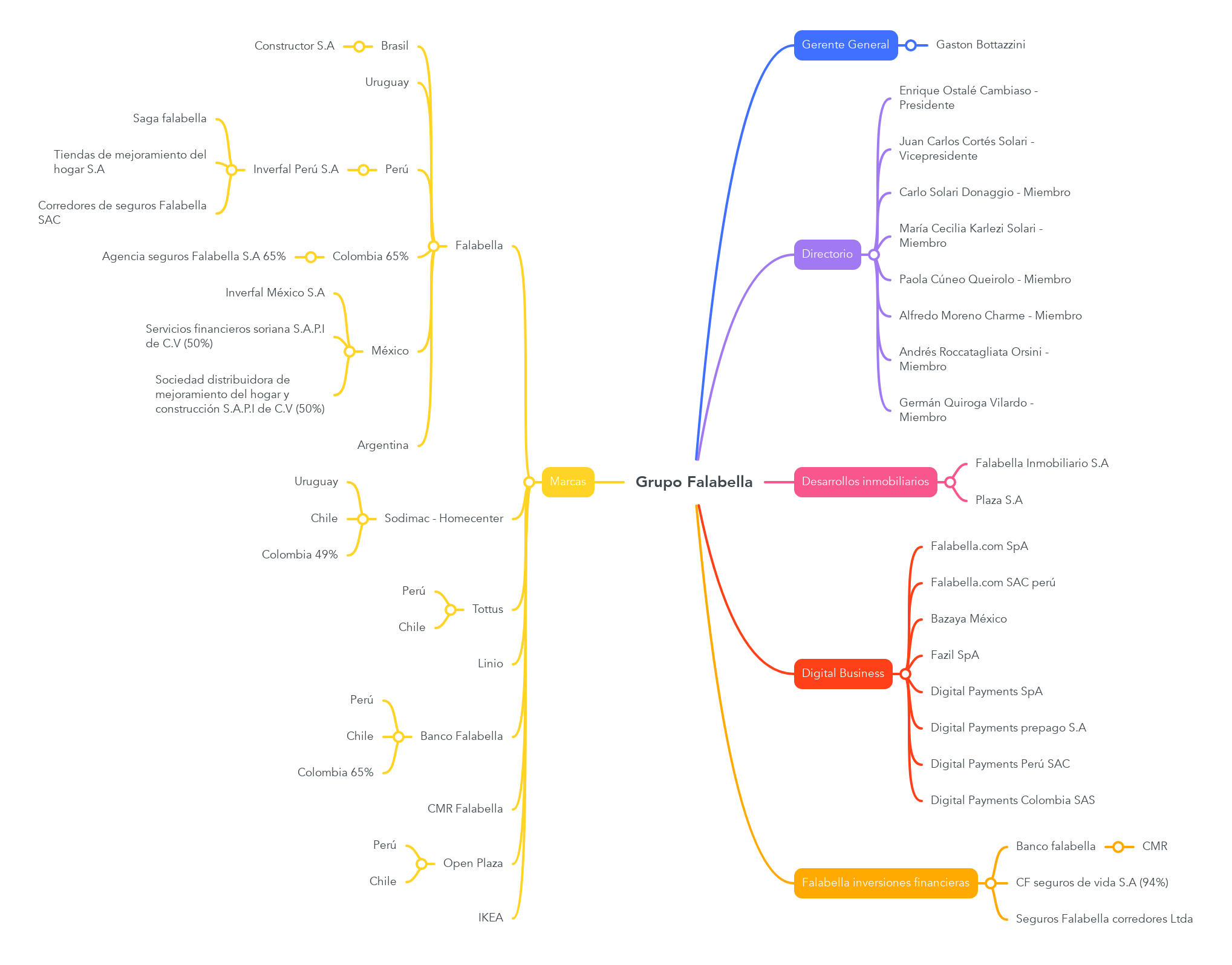 El Grupo Falabella tiene presencia en varios países de la región, incluyendo Chile, Perú, Colombia, Argentina, Brasil y Uruguay. Sus principales áreas de negocio son tiendas por departamento, mejoramiento del hogar, supermercados, servicios financieros y comercio electrónico.